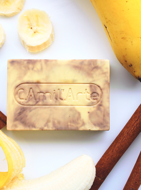 Ingredientes: Base glicerina vegetal, essência de banana,essência de canela,láuril, corante, extrato de canela.